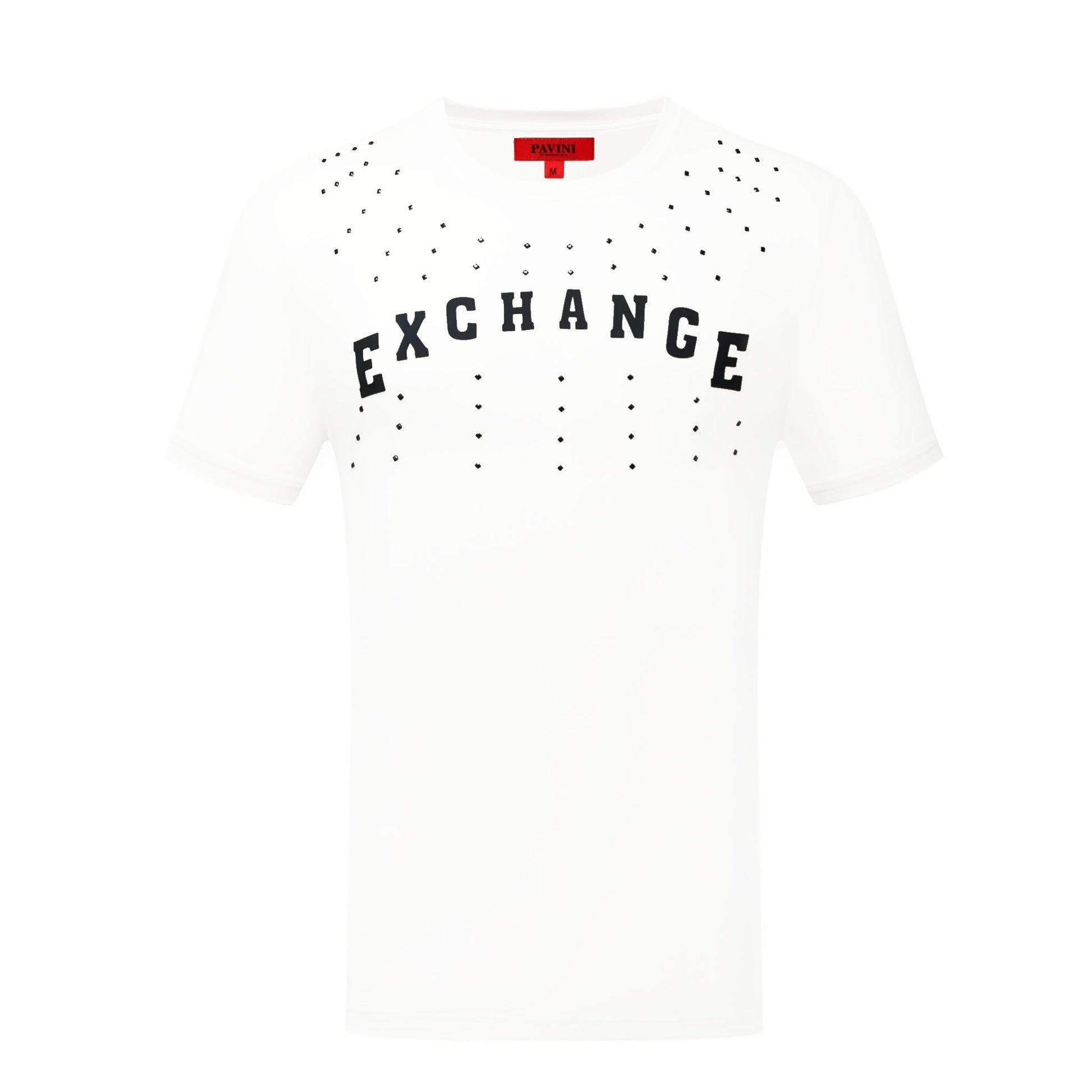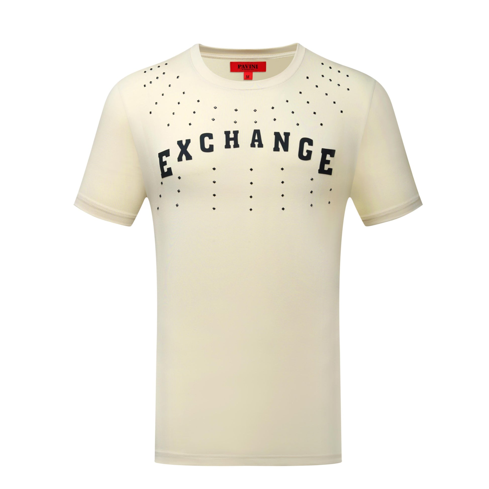 The PAVINI PT-536 (Beige) delivers a clean, modern look with bold EXCHANGE lettering across the chest, finished with subtle stud-style dot detailing for an elevated street-luxe vibe. The soft beige tone keeps it versatile, while the graphic placement makes it an easy statement piece.